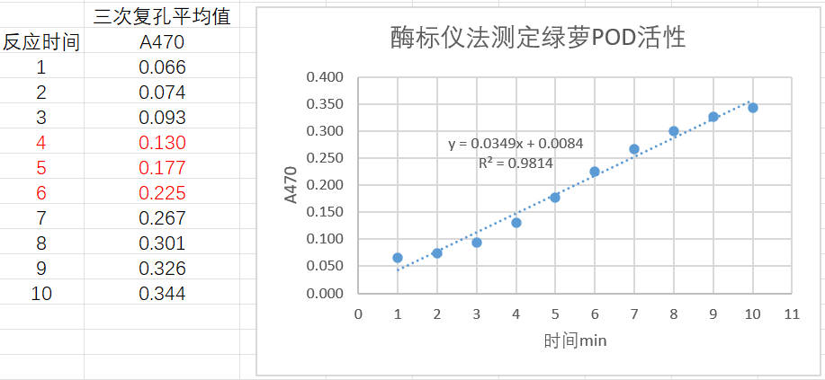 取0.5 克綠蘿葉片,加入5 ml提取液冰浴勻漿,制成10%勻漿液,12000 rpm 4℃離心10 min,取上清置于冰上,按照測定步驟操作,三個復孔,設定酶標儀檢測波長470 nm,間隔1 min采集數據,采集10次;時間對吸光值做線性回歸曲線,4-6 min線性較好,2 min內△A=0.225-0.130=0.095。